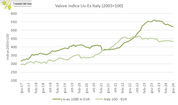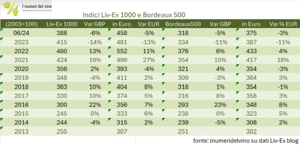 - L’indice Liv-Ex dei 1000 grandi vini ha chiuso a giugno a un valore di 388, che tradotto in Euro al cambio medio del mese significa 458. Si tratta del punto più basso da agosto 2021 e corrisponde a un calo del 14% in sterline e del 13% in Euro per il 2023, oltre a un ulteriore correzione del 5/6% nei primi 6 mesi del 2024.