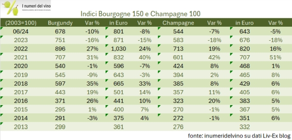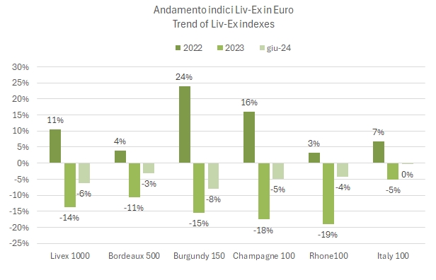 - Lo stesso vale per i primi 6 mesi di quest’anno. I vini italiani chiudono stabili contro -3% per Bordeaux, -4% per il Rodano e -5% per lo Champagne. Il caso particolare sono i vini di Borgogna, che hanno avuto un inizio di 2024 particolarmente difficile, con un ulteriore crollo dell’8%.