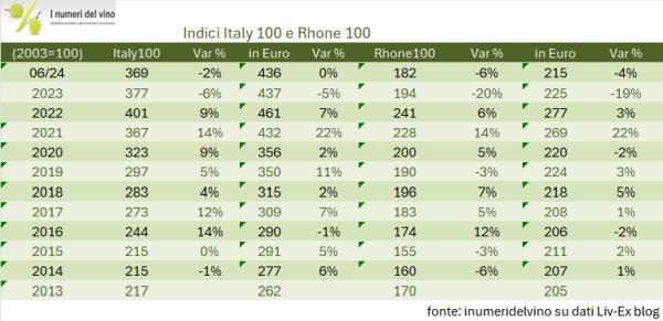 - Per quando riguarda l’andamento 2023 (tutti i dati ribasati in euro), l’indice “Italy 100” è stato il migliore, con un calo del 5%. Si confronta con un calo a doppia cifra di tutte le altre categorie: -11% per Bordeaux, -15% per la Borgogna, -18% per gli Champagne e -19% per il Rodano.