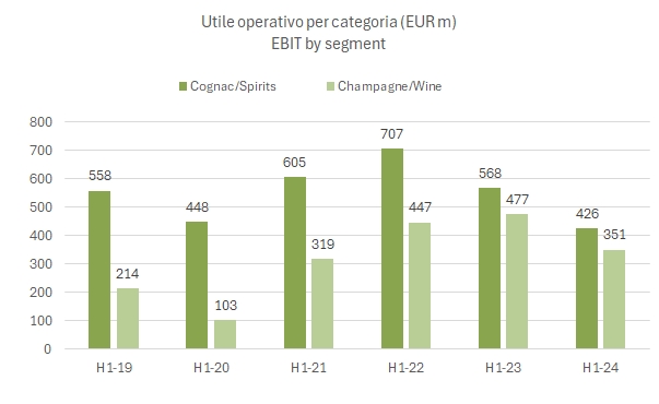 • I margini di profitto sono in calo, con un utile operativo della divisione di 777 milioni come dicevamo, il che implica un calo del margine dal 33% al 28%. All’interno del dato, lo Champagne e i vini hanno un utile operativo di 351 milioni nei sei mesi, per un margine del 25%. In confronto il margine del Cognac e degli spiriti (che cala in maniera analoga, -26%), sono ancora molto superiori, intorno al 30%.