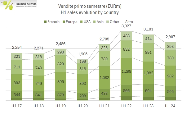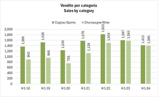 • Se entriamo nel dettaglio, le consegne di Champagne sono state 25.6 milioni, -15% sul semestre 2023, quelle dei vini fermi invece sono cresciute a 31.2 milioni, +16% grazie alle acquisizioni. Il prezzo medio di vendita è sceso del 12% da 27.8 a 24.6 euro.