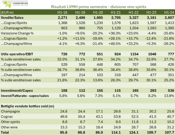 Anno cattivo o ritorno alla normalità? I dati del primo semestre di LVMH divisione vino e spiriti sono in forte calo, ossia -12% per le vendite e -26% per l’utile operativo. Se prendiamo il numero in valore assoluto di 777 milioni di utile operativo semestrale e lo confrontiamo con quello del 2019, 772 milioni, allora forse possiamo dire che i dati sono piuttosto cattivi. L’azienda ha continuato a investire pesantemente in questi anni, vende il 10% in più del 2019 sia in volume che in valore e fa gli stessi utili di 5 anni fa, poco prima del Covid. Unica eccezione nel quadro grigio sono, per assurdo, i vini fermi che crescono in volume da 27 a 31 milioni di bottiglie, grazie alle acquisizioni. Resiste la Francia, calano gli USA, l’Europa e crolla il mercato asiatico dove molto del Cognac di LVMH va a finire. Qualcuno comincia a dire che LVMH potrebbe un giorno sbarazzarsi del segmento vino e spiriti. Vedremo cosa succede. Per ora concentriamoci sui numeri del semestre nel resto del post con tabelle e grafici.