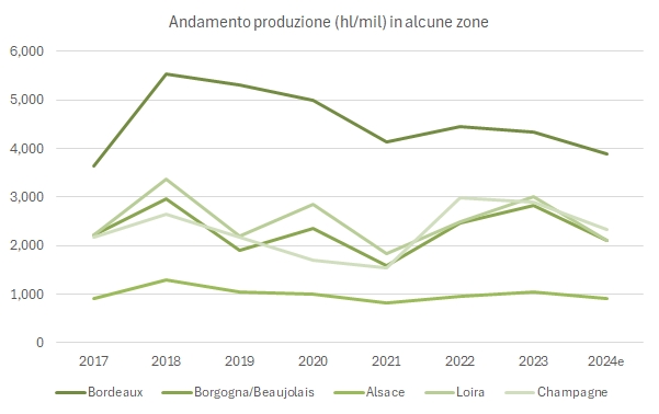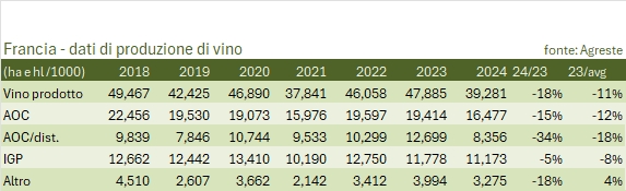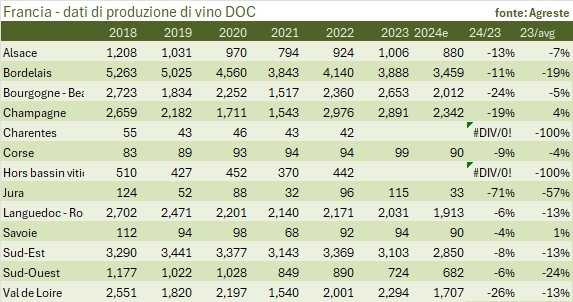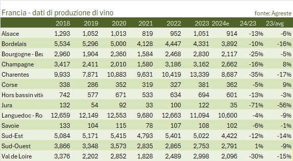 • Il 2024 si prevede un anno invece largamente sotto la media, particolarmente per la zona di Bordeaux, per la prima volta sotto i 4 milioni di ettolitri (anche grazie agli espianti), -16% sugli ultimi 5 anni, la Chartentes a 8.7 milioni di ettolitri (quasi tutti destinati alla distillazione), e il Sud-Est della Francia che è previsto produrre solo 4.4 milioni di ettolitri, il 14% sotto la media dei 5 anni. La Borgogna torna a 2.1 milioni, il 5% sotto la media, mentre per la Champagne siamo sui 2.7 milioni di ettolitri, meno 16% sul 2023 ma comunque sopra la media dei 5 anni, caratterizzata da una vendemmia particolarmente povera nel 2021.
