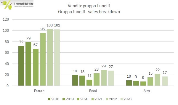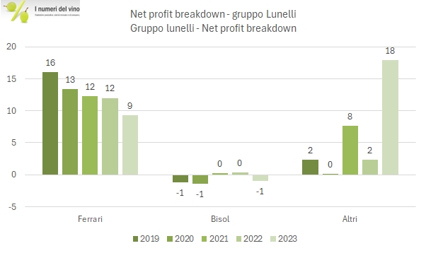 • L’utile netto del gruppo è stato guidato dalle componenti non operative, con proventi finanziari di 17 milioni, contro i 5 del 2022, e rivalutazioni per 5 contro 1 del 2022. L’utile netto di Ferrari è stato invece in calo da 12 milioni a 9 milioni (anche influenzato dalle decisioni di finanziamento delle controllate), mentre quello di Bisol passa da un leggero utile a una perdita di 1 milione.