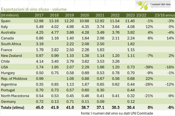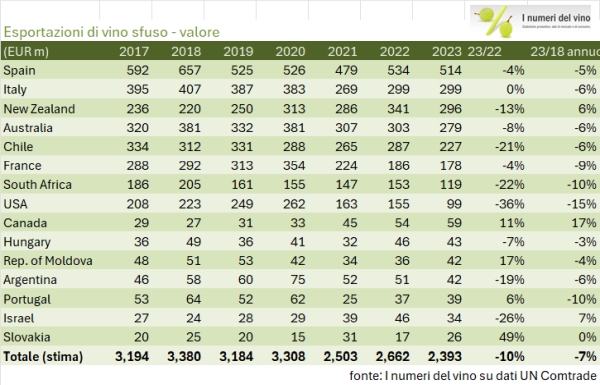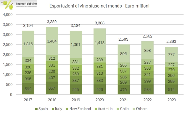 - In base ai dati di 93 nazioni, le esportazioni mondiali di vino sfuso sono state circa 2.4 miliardi di euro, in calo del 10% a valore rispetto al 2022 e del 7% annuo dal 2018 a questa parte.