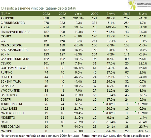 Ultima puntata del lavoro sul rapporto Mediobanca. Parliamo oggi di debiti e di leva finanziaria delle principali aziende vinicole italiane. La prima cosa da dire è che i debiti di queste 24 aziende analizzate sono cresciuti del 23% nel 2023, diciamo pure il ritmo più sostenuto “di sempre”. La ragione è semplice: siamo di fronte a un processo di consolidamento del settore dove si stanno creando alcuni poli (IWB, Argea per esempio) in alcuni casi guidati dal private equity, e nel 2023 in particolare, Antinori si è portata a casa una grande azienda vinicola americana (Stag’s Leap Wine Cellar), facendo crescere in modo importante il suo debito (e a conti fatti, il 90% dell’incremento del debito del campione è proprio da associare ad Antinori). Questo non significa un peggioramento degli indici di bilancio, in quanto il maggiore debito è stato parzialmente compensato dal maggior patrimonio e dai maggiori utili operativi. Certamente nel 2023 questo maggiore debito si è combinato a tassi di interesse più elevati e ha quindi determinato un impatto negativo sugli utili che abbiamo potuto apprezzare nei dati commentati nelle scorse settimane. Bene, nel ricordarvi che le tabelle incluse nel post si riferiscono esclusivamente alle aziende con oltre 100 milioni di euro di fatturato, vi invito a proseguire nella lettura.