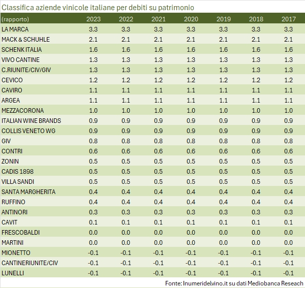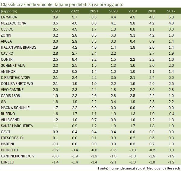 Indebitamento e leva delle principali aziende vinicole – dati Mediobanca 2023