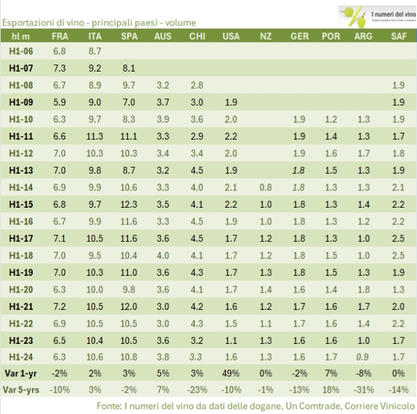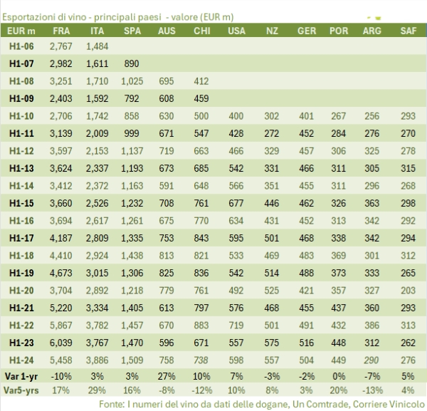 Con un po’ di fatica in questo giro ho ricostruito il quadro delle esportazioni mondiali di vino del primo semestre 2024. Dei dati che vedete in tabella soltanto due sono stimati sulla base dell’andamento di 3-4 mesi invece che sui dati reali dei 6 mesi. Si tratta di Argentina e Cile.