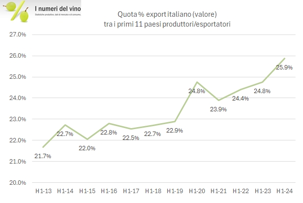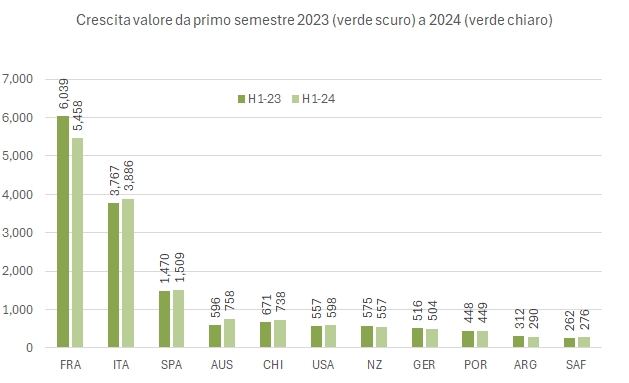 Fatta questa premessa, il quadro del semestre è di un leggero calo delle esportazioni mondiali, circa -1% a valore, con un parziale recupero dei volumi, +3%, dopo il pesante calo del 2022-23 (circa -10% nei semestri cumulativamente). Come abbiamo avuto modo di commentare nelle scorse settimane l’Italia ne esce vincente, con un incremento delle esportazioni del 3% (diventato +4% a fine luglio) simile a quanto registrato dalla Spagna. Ci sono un paio di esportatori che fanno meglio, Australia e Cile, ma in questi casi va considerato il punto di partenza molto basso e gli eventi recenti (riapertura della Cina per il vino australiano). In termini relativi l’Italia guadagna circa un punto percentuale nella “quota di mercato” sul totale di questi 11 paesi. Una buona notizia per il settore domestico, che però ricordo restare molto esposto in termini di volume (10.6 milioni di ettolitri nei sei mesi 2024), con un rischio di calo.