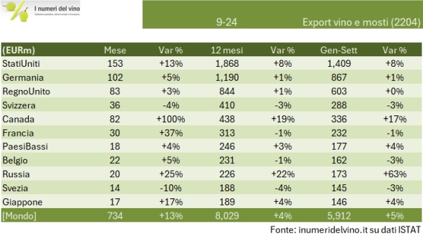 - Le esportazioni di settembre crescono del 13% a 734 milioni di euro, portando il saldo 2024 a 5.9 miliardi di euro, +5% e quello degli ultimi 12 mesi a 8029 milioni, +4%.