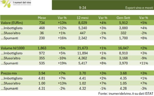 Come avrete già letto, settembre è stato un ottimo mese per le esportazioni di vino italiano, con un incremento del 13% sull’anno precedente, quando però a loro volta le esportazioni erano calate del 10%. A loro volta le esportazioni erano poi cresciute lo scorso anno dell’8% in ottobre il che porrà un confronto difficile. Ad ogni modo, l’Italia “mette via” un incremento del 5% sui 9 mesi che visto quanto succede in Francia è un risultato piuttosto positivo. Sull’arco dei 12 mesi siamo saliti sopra la soglia psicologia degli 8 miliardi di euro, succede per la prima volta nella storia delle nostre esportazioni.