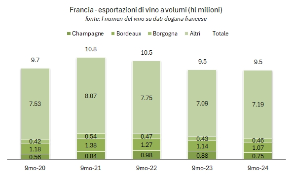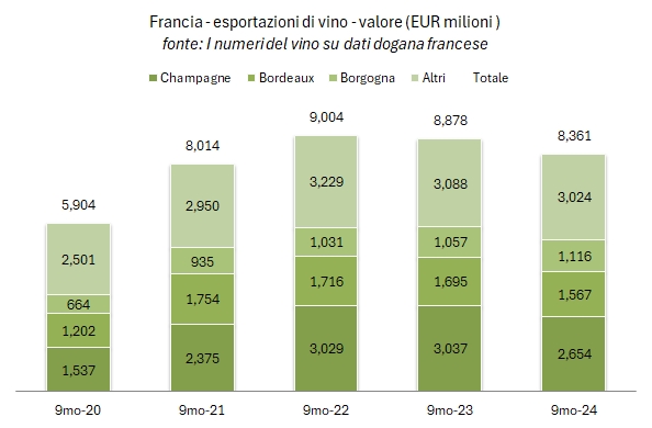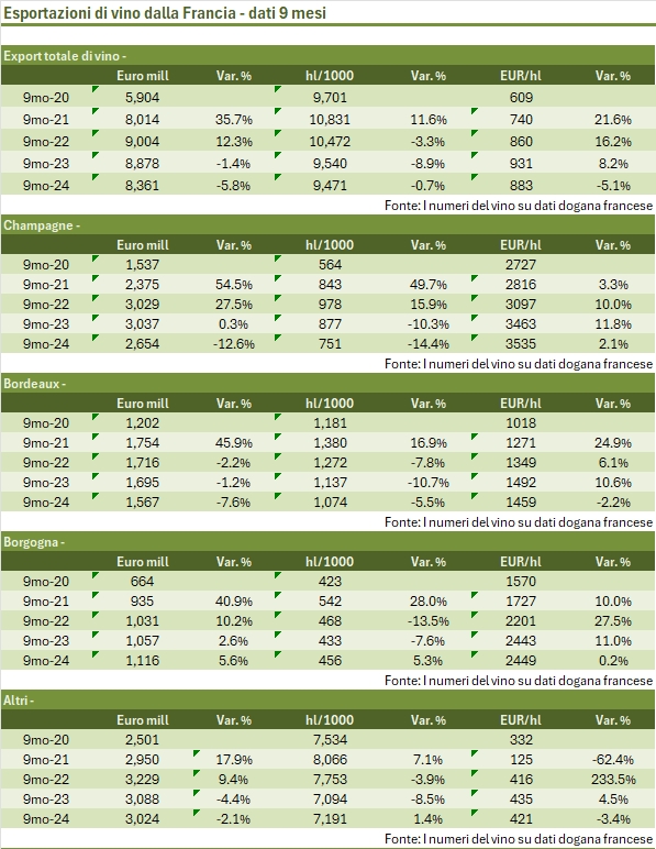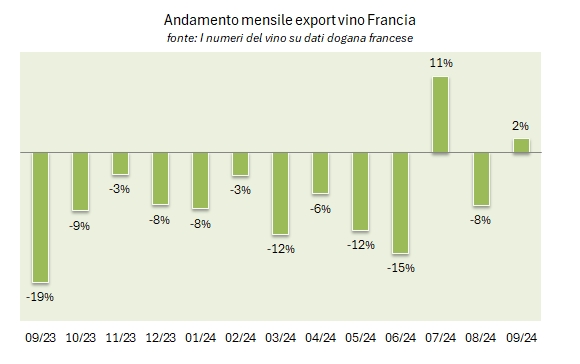 - Le esportazioni di vino francese a fine settembre toccano quota 8.36 miliardi di euro, per un calo del 5.8%, che si compone di un volume esportato giù dello 0.7% e un prezzo medio di export calato del 5% a 8.83 euro al litro.