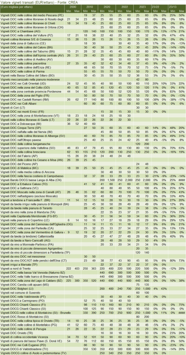 • CREA recensisce valori massimi e minimi delle transazioni di terre relative anche a circa 70 denominazioni o aree vinicole specifiche.