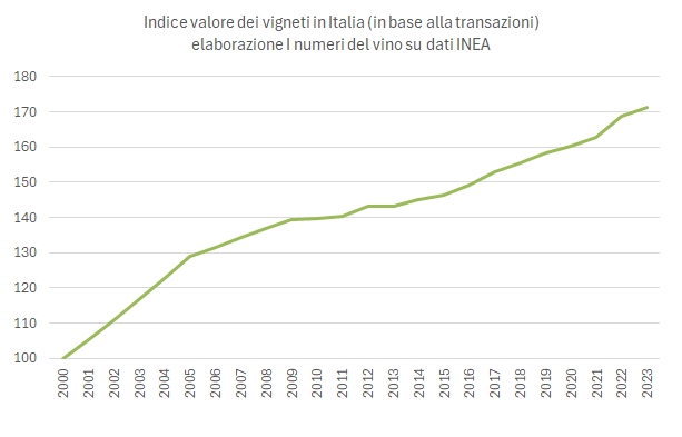 Per il 2023, da questo calcolo si deriva un incremento del valore delle vigne dell’1.5% rispetto al 2022, quando si era registrato un incremento del 3.8%. Con dei tassi di inflazione rispettivamente del 5.7% (2023) e 8.1% (2022), si tratta dunque del secondo anno in cui nel loro insieme i vigneti italiani non tengono il passo con la perdita di valore della moneta. E lo vedremo ancora più nel dettaglio con l’altro post derivato da CREA, dove invece che analizzare i dati per denominazione vengono analizzati per area geografica.
