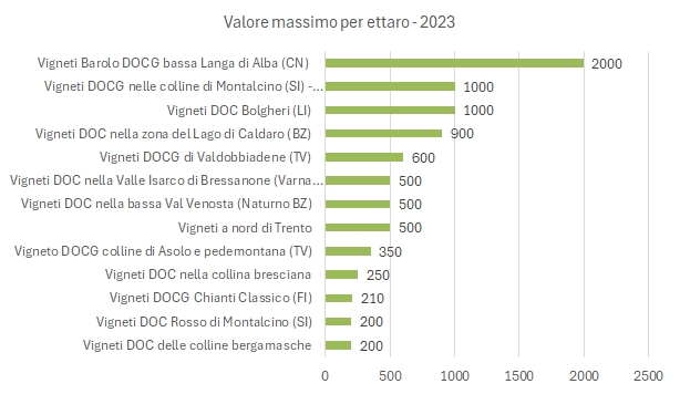 • Se guardiamo invece ai vigneti più pregiati, espressi nei loro valori massimi troviamo i vigneti del Barolo (2 milioni per ettaro), poi quelli del Brunello di Montalcino e di Bolgheri (1 milione per entrambi), i vigneti dell’area di Caldaro (0.9 milioni) e quelli di Valdobbiadene (0.6 milioni).