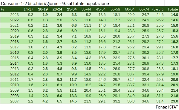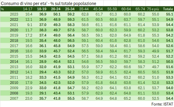 La questione del consumo di vino (e di alcol) delle nuove generazioni imperversa e per questo ho riguardato i dati ISTAT sulla penetrazione del consumo di vino per fasce di età, che con questo blog recensisco dal lontano 2007. Questo consente non soltanto un’analisi delle classi di età nel tempo, ma anche un’analisi parziale (su 15-20 anni) di come la penetrazione del consumo si evolve nel tempo per le stesse coorti. I dati qui analizzati arrivano all’indagine 2023, avremo una nuova serie tra breve (di solito aprile-maggio).