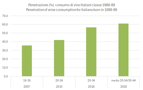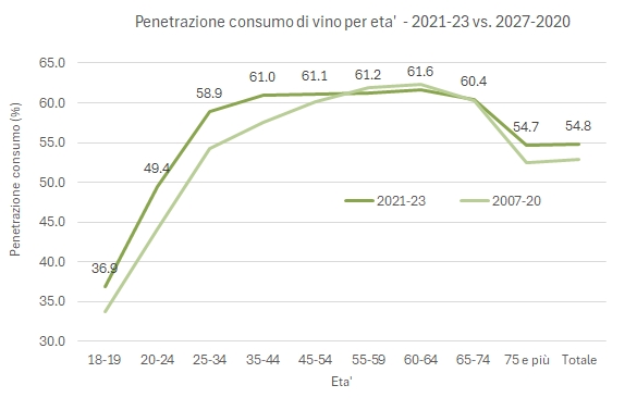 - Se guardiamo alle fasce dei giovani, negli ultimi 2-3 anni la penetrazione di consumo di vino è tra 4 e 5 punti percentuali superiore a quella media storica. È vero che sono stati gli anni del Covid ma è anche vero che la penetrazione sul totale della popolazione è del 54.8% nel 2021-23, contro una media del 53% nel 2007-2020. Numeri alla mano, la media della fascia 18-34 anni (le ho messe insieme) è stata nel 2021-23 del 48.4% contro un dato del 44% nel periodo 2007-2020.