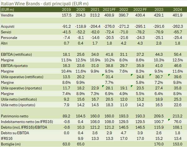 - Passando ai margini, l’EBITDA tocca quota 12.5%, un ottimo risultato per un’azienda che non ha quasi per niente integrazione nella fase agricola. Si torna ai livelli di 4-5 anni fa, dopo l’inflazione sui costi del vetro e dell’energia, che infatti nel 2024 sono calati. Calano anche ammortamenti e svalutazioni (10.8 contro 13.6 milioni), gli oneri finanziari (5 milioni contro 8 lo scorso anno) e così si arriva a un utile netto rettificato di 25.3 milioni, contro 19 dell’anno passato.