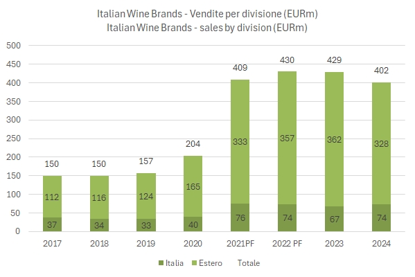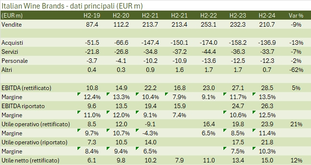 Come annunciato con alcuni dati preliminari a febbraio, il 2024 di Italian Wine Brands si è concluso con un ulteriore importante progresso nei margini e nella generazione di cassa – già vista nel primo semestre – ottenuta nonostante un calo del 6% del fatturato (diventato più evidente nel secondo semestre, -9%) a 402 milioni. I principali dati parlano di un EBITDA cresciuto del 14% a 50.4 milioni (46.6 dopo i costi straordinari), di un utile operativo balzato del 30% a 40 milioni (36 dopo i costi straordinari) e di un utile netto di 25 milioni, 34%. Il debito scende di 25 milioni a 76 milioni, con un rapporto (incluso IFR16) di 1.8 volte l’EBITDA. Ottimi risultati, dunque, ottenuti grazie al calo di alcuni costi parzialmente fuori controllo dell’azienda (vetro, energia, materia prima vino) ma anche grazie alle sinergie di costo già previste con le acquisizioni fatte, visibili per esempio in un costo del personale stabile.