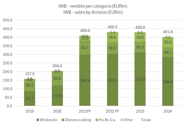 - Le vendite sono calate del 6% a 402 milioni, di euro, di cui 284 milioni sono vendite all’ingrosso (-9%), 58 milioni sono “distance selling”, ovvero B2C (-7%) e 59 milioni sono Ho.Re.Ca. (+8%). Le vendite online, incluse nel B2C sono cresciute del 5%.