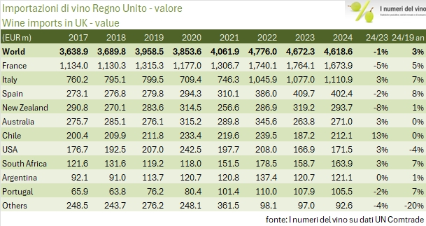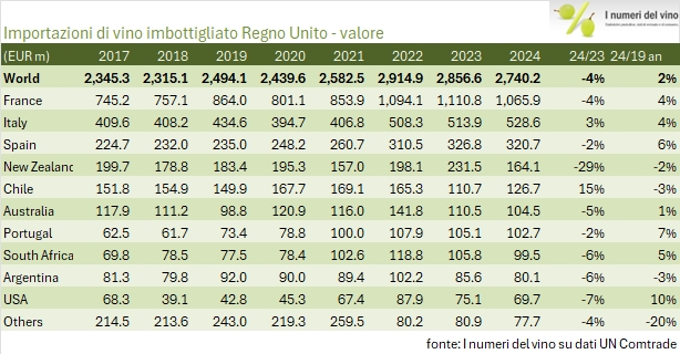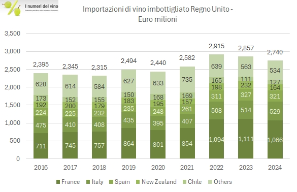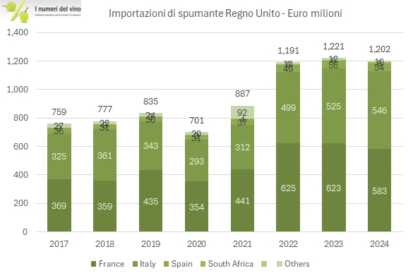 La Spagna si conferma come terzo fornitore con importazioni pari a 402,4 milioni di euro nel 2024, in leggero calo del 2% rispetto al 2023. Tuttavia, la crescita media annua dell’8% rispetto al 2019 è tra le più elevate tra i principali esportatori, dimostrando un rafforzamento del posizionamento spagnolo nel mercato britannico. Il segmento predominante rimane quello dei vini imbottigliati (320,7 milioni di euro, -2%), mentre gli spumanti spagnoli, pur rappresentando una quota minore (54,5 milioni di euro, -2,5%), mantengono una presenza significativa nel loro segmento di prezzo.