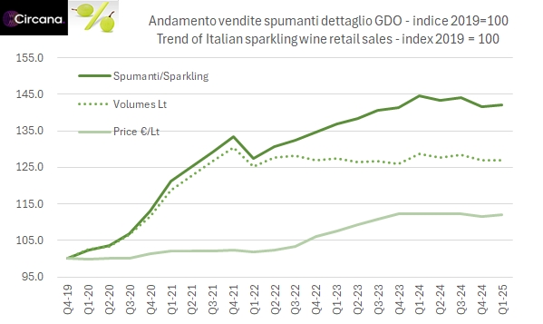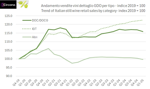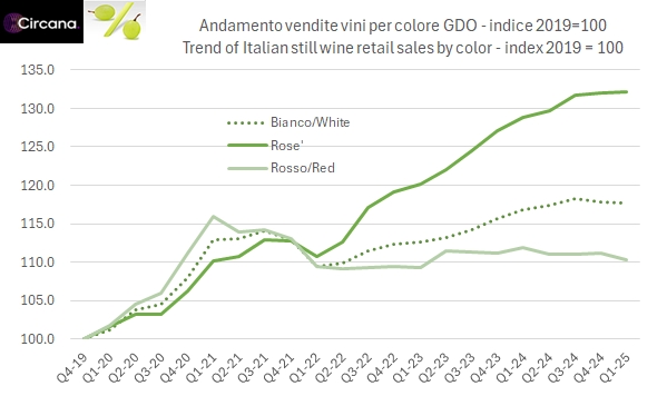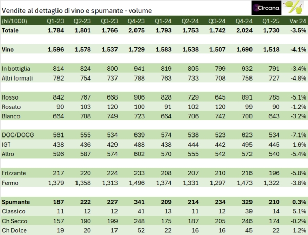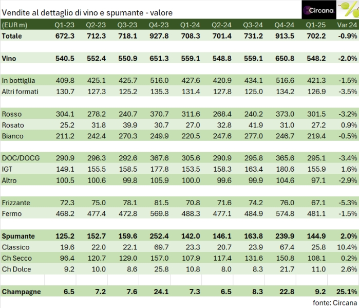 Vendite al dettaglio di vino (GDO Italia) – dati Circana, primo trimestre 2025