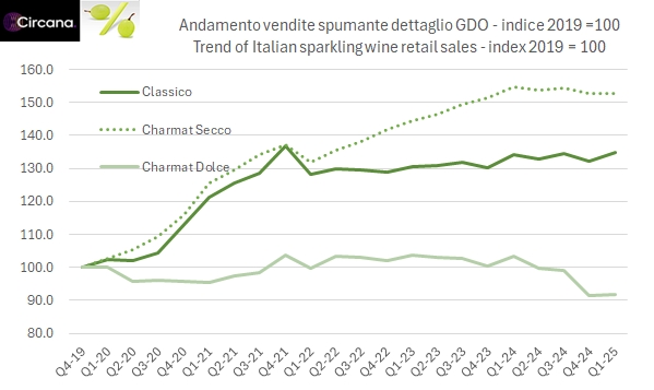 Ricevo e analizzo a stretto giro i dati di vendita di vino nella GDO come sempre cortesemente forniti da Circana. Il primo (e secondo) trimestre sono usualmente i periodi meno importanti per le vendite di vino e sono tipicamente influenzati dalla tempistica ballerina delle vacanze Pasquali, che fornisce certamente un impulso ai consumi. Nel periodo gennaio-marzo 2025 le vendite sono calate dell’1% a 702 milioni (vino fermo + spumante + Champagne), dopo il calo dell’1.5% del quarto trimestre 2024, a causa di un forte calo dei volumi acquistati (-3.5%, -4% per il vino fermo soltanto). Gli spumanti sono di nuovo un po’ meglio dei vini fermi (+2% contro -2%), i bianchi e i rosati sono meglio dei vini rossi, mentre più sorprendente è il calo dei vini DOC (-3.4%), cui fa da contraltare un andamento migliore per i vini IGT, che costano mediamente il 35% in meno… e che rappresentano quindi un segno molto tangibile del taglio della spesa dei consumatori.