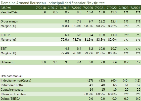 - Domaine AR sembrerebbe avere avuto un 2023 in calo (probabilmente a causa della scarsa vendemmia) con un utile netto a -16% a 6.7 milioni di euro ma un recupero nell’anno fiscale chiuso a luglio 2024, quando il rimbalzo del 15% ha riportato l’utile a quota 7.7 milioni, non distante dai livelli record del 2021-22.