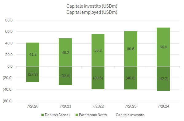 - L’azienda continua a generare cassa in modo copioso, anche se questo non emerge dalla posizione finanziaria netta, che è rimasta nell’intorno dei 40 milioni di cassa (42 nel 2024) in quanto il Domaine ha acquistato delle partecipazioni classificate tra le immobilizzazioni finanziarie, che quindi potrebbero non essere “investimenti della cassa” ma magari altre aziende vinicole: il bilancio nulla dice salvo che questo dato che era di 1 milioni è diventato 4 nel 2023 (+3) e 9 milioni nel 2024 (+5), quindi circa 8 milioni di cassa sono andati a finire dentro lì. Va anche notato che negli ultimi due anni il capitale circolante è cresciuto a 3 milioni di euro con un magazzino che dai tipici 2-2.5 milioni di euro si sta avvicinando ai 3 milioni di euro.