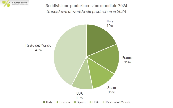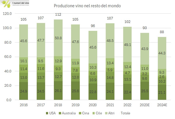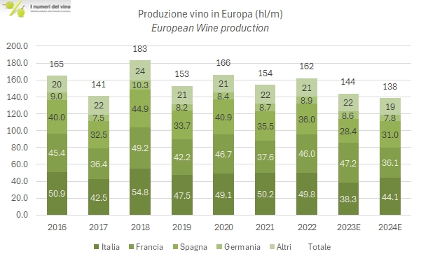 - La produzione mondiale di 226m/hl si suddivide in circa 138 m/hl nell’Unione Europea, in calo del 4% rispetto al 2023 e del 12% circa al di sotto della media decennale; e 88 milioni di ettolitri nel resto del mondo, -6% sul 2023 e il 15% sotto la media degli ultimi 10 anni.