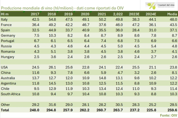 OIV ha ridisegnato al ribasso la nuova stima della produzione mondiale di vino 2024. A ottobre aveva detto 231milioni di ettolitri, il nuovo dato indica 226m/hl. Si tratta di una revisione del 2% circa al ribasso, guidata principalmente dalla produzione USA di vino, ora vista a 21m/hl contro i precedenti 23.6m/hl, il che significa una produzione del 10-11% sotto la media storica per il paese, e dall Spagna, ora inserita nel database con 31m/hl contro i 33.6m/hl precedenti. Per converso la produzione italiana è stata rivista al rialzo da 41 a 44 milioni di ettolitri (ISTAT dice 48 ma sappiamo che OIV prende il dato del MIPAAF basato sulle dichiarazioni di produzione).
