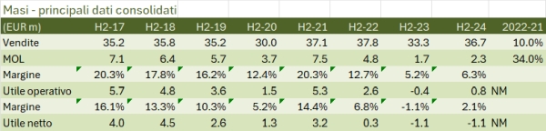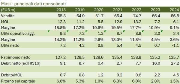 Masi archivia senza ombra di dubbio il peggiore anno da quanto analizziamo i conti (2014). Sebbene le vendite abbiano tenuto, i margini sono ulteriormente calati, scendendo sotto il 4% a livello operativo, e il peso del maggiore debito (i forti investimenti continuano) ha portato il bilancio a chiudere in leggera perdita, cosa mai capitata nemmeno nello scellerato 2020. La storia degli ultimi anni è stata quella di continui investimenti, soprattutto nella brand house Monteleone21, che sembra essere pronta per l’apertura al grande pubblico nel 2025. In questo senso, e pur considerando che Masi ha un posizionamento difficoltoso se consideriamo Valpolicella-Amarone (vini rossi, grado alcolico elevato), ci sono le premesse per vedere una inversione della tendenza negativa degli ultimi anni (vedendo anche un secondo semestre migliore) e un rientro dalla situazione debitoria che ha raggiunto quota 27 milioni (36 compreso IFRS16), rispetto ai 16 dello scorso anno e ai circa 9 del 2019, anno precedente alla crisi del Covid.
