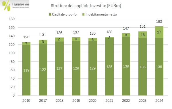 - Dal punto di vista finanziario, Masi ha un debito finanziario di 27 milioni, +11 milioni rispetto al 2023, e sta rinegoziando un allungamento delle scadenze con il sistema bancario. Ovviamente, data l’enorme dote di attivi fissi (vigneti, immobili e via dicendo) non è un dato particolarmente preoccupante, anche se chiaramente gli investimenti degli ultimi anni si sono fatti sentire (11 milioni nel 2024, probabilmente il “colpo finale” per completare il centro visitatori). I dividendi pagati agli azionisti sono scesi da 2 milioni a 1 milione di euro, mentre il capitale circolante ha determinato un assorbimento di 4 milioni, nonostante il magazzino stabile, a causa dell’aumento dei crediti verso clienti per il buon andamento delle vendite del secondo semestre.