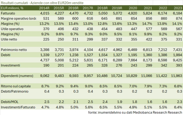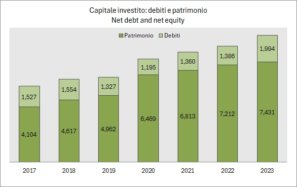 - Questo incremento degli interessi passivi ci ricollega alla parte finanziaria: l’indebitamento finanziario netto sale da 1.4 a 2 miliardi di euro, per un rapporto con l’EBITDA di 2.3 (da 1.6). Il capitale investito cresce da 8.6 a 9.4 miliardi per via dei crescenti investimenti (393 milioni nel 2023, il 6.4% del fatturato, livello più alto dal 2018) ma anche del capitale circolante. Pur rimanendo molto ben patrimonializzato (debito/patrimonio 0.3), il settore ha visto quindi un incremento della leva finanziaria, probabilmente anche legato al maggiore dinamismo della parte acquisizioni.