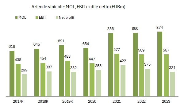 - Il margine industriale è migliorato dal 23% al 23.6%, ma il progresso è stato mangiato da un incremento del costo del personale del 4.6%, costato lo 0.4% di margine che porta quindi l’EBITDA sulle vendite a un progresso più limitato, dal 13.9% al 14.1%, per un valore di 873 milioni, comunque il più elevato del campione. Anche in questo caso se allarghiamo lo sguardo a 5 anni, vediamo che le aziende vinicole italiane hanno guadagnato in produttività (a differenza del 2023), visto che a fronte di un incremento annuo del 5.6% del margine industriale, il valore aggiunto cresce del 6.3% annuo, implicando un incremento più moderato del costo del personale. L’utile operativo è stabile al 9.2% vista la crescita dell’incidenza degli ammortamenti.