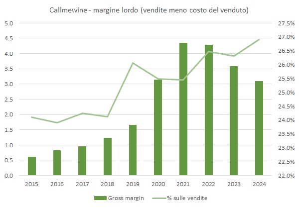 Callmewine è la prima azienda di ecommerce di vino di cui analizziamo i dati 2024 e la vista non è di quelle piacevoli. La sensazione personale è che alcune di queste aziende abbiano cambiato strategia. Inizialmente la logica era diventare sempre più grandi offrendo buoni prezzi (e subendo un margine più basso dell’enoteca) e diventare profittevoli con l’aumento della scala. Stile Amazon insomma. Oggi se guardiamo ai dati, dopo la sbornia del Covid, siamo passati dalla ricerca della dimensione alla ricerca dei margini, lasciando il primo percorso “a metà strada”. Lo vediamo da questi numeri dove il margine lordo % sulle vendite cresce, i costi scendono con un calo delle vendite del 16%, lo leggiamo su internet quando Tannico parla di un “aumento dello scontrino medio”.