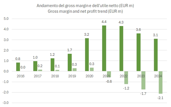 - Purtroppo con 2 milioni di vendite in meno era difficile fare di meglio: la perdita operativa sale da 2.2 a 2.7 milioni di euro, la perdita netta da 1.7 a 2.1 milioni, grazie alla linea delle imposte, che segna un credito di 0.7 milioni da 0.5 dello scorso anno.