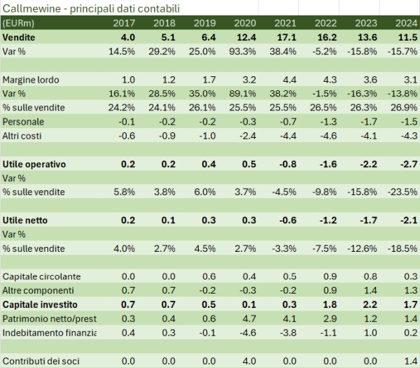 Tornando a Callmewine, il 2024 è un anno molto difficile che segue la traiettoria partita nel 2021 di perdite sempre più marcate, che arrivano a 2.1 milioni di euro. La struttura finanziaria torna in equilibrio grazie al contributo dei soci di 1.4 milioni di euro in aumento di capitale, oltre a un ulteriore 1 milione di euro a titolo di prestito soci, il secondo dopo i 4 milioni iniettati nel 2020.