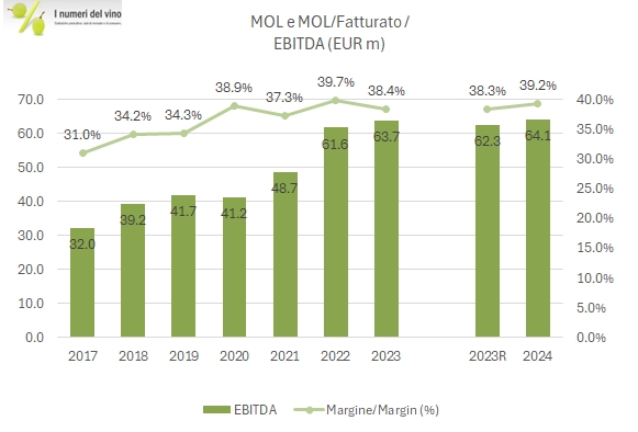- L’EBITDA cresce da 62 a 64 milioni di euro, +3%, beneficando della minore incidenza dei costi delle materie prime e dei servizi, compensato parzialmente da un leggero incremento dei costi del personale. Il margine, pur non completamente comparabile con il passato, passa al 39.2% (+0.9% rispetto al 2023 ribasato), quasi al massimo storico del 2022.