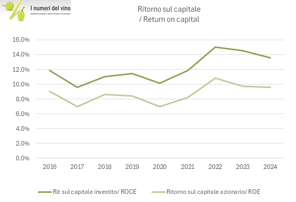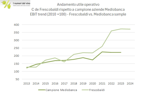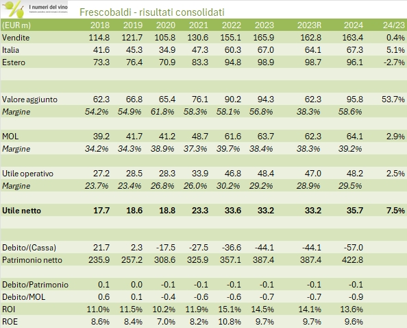 Tornando al 2024 di Frescobaldi, è stato un anno senza grandi operazioni straordinarie, salvo che per l’acquisto dell’1% di Ornellaia e Masseto per un importo di 5.2 milioni di euro, tramite una controllata (Tenute di Toscana) di cui Frescobaldi detiene il 74%. Oltre al fatturato stabile, i margini si sono riportati al 39% (EBITDA) e dopo investimenti di circa 25 milioni di euro e dividendi di 13 la posizione di cassa netta del gruppo è salita da 44 a 57 milioni di euro. Il 2025 vede l’entrata di Frescobaldi nei vini dell’Etna, con l’acquisizione del 40% di Tenuta delle Terre Nere, per un investimento, secondo Winenews, di 15-20 milioni di euro.