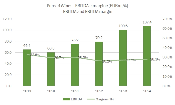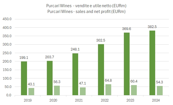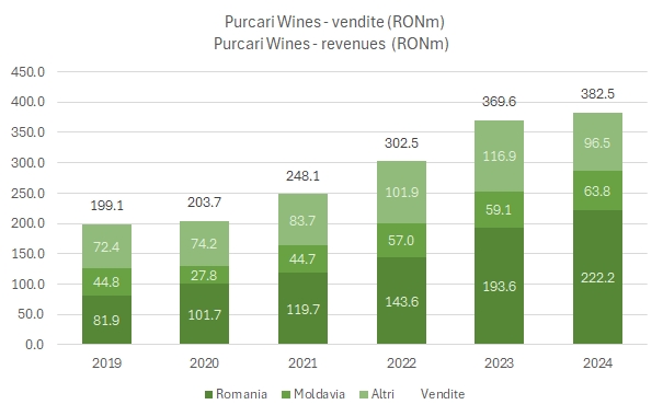 Il prezzo a cui viene proposta l’acquisizione è di 21RON (vedere grafico qui sopra, prezzo mai raggiunto dalle azioni), che corrispondono a un valore totale di 840 milioni di RON e a un valore di impresa di 1.03 miliardi di RON (che diviso 5 fa circa 200 milioni di euro). Se consideriamo le attese degli analisti per il 2025 di Purcari (piuttosto aggressive visto l’andamento molto poco convincente che commenteremo di seguito – 470 milioni di RON di vendite 131 milioni di EBITDA e 63 milioni di utile netto), l’acquisizione proposta è a un multiplo di 2.2 volte le vendite, 8 volte l’EBITDA e 13 volte gli utili.