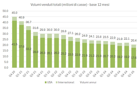 • Dal punto di vista finanziario, il debito (che non vede ancora l’incasso della dismissione dei vini, chiusa il 2 giugno) sale a 11.5 miliardi di dollari, un po’ più sia di fine febbraio che di maggio 2024, con una distribuzione agli azionisti di 488 milioni di dollari tra dividendi e riacquisti azionari (385 lo scorso anno) e un taglio degli investimenti a 196 milioni (375 milioni un anno fa).