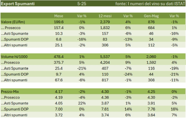 - Nel segmento specifico degli spumanti, il dato di maggio del Prosecco è stabile, mentre calano le altre categorie. Per quanto riguarda i mercati, va segnalato l’andamento negativo della Germania nei primi 5 mesi, -12%.