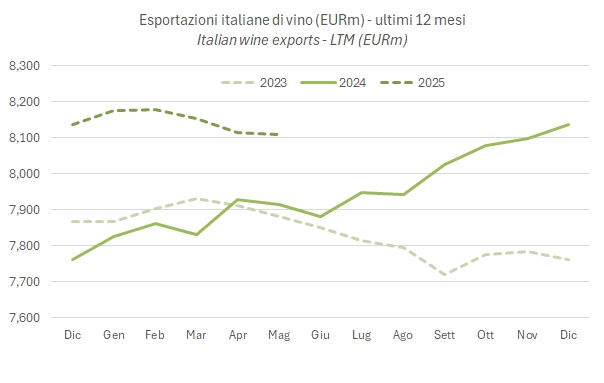 I dettagli mostrano una “normalizzazione” a livello geografico, dopo i forti scossoni di marzo e aprile, occorsi in concomitanza con le discussioni sui dazi. Gli USA si stabilizzano (+3%), mantenendo un passo positivo da inizio anno (+6%), sono leggermente negativi Germania e Regno Unito, va sempre molto bene il Canada mentre si riprendono le spedizioni in Russia. Anche per le categorie a forte valore aggiunto il dato di maggio è perfettamente allineato allo scorso anno, con una migliore tenuta dei volumi per i vini spumanti rispetto ai vini fermi.