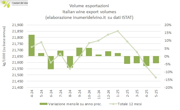 Il dato di maggio segna un valore quasi stabile per le esportazioni di vino italiane, dopo due mesi piuttosto negativi (quasi -5%), il che consente di chiudere i primi 5 mesi dell’anno a -1% per 3208 milioni di euro, con un volume calato del 4% a 8.5 milioni di ettolitri.