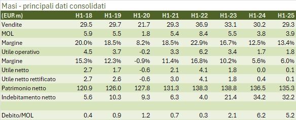 Masi chiude il primo semestre 2025 con ricavi in leggero calo (-3%) ma margini stabili, peraltro sui livelli molto bassi dello scorso anno. Due però sono le novità più importanti del gruppo: primo, l’investimento nel nuovo visitor center Monteleone 21 è finalmente terminato ed è stato aperto a maggio 2025. Secondo, l’azienda ha raggiunto (anche se non reso pubblico) un accordo di rifinanziamento del debito con le banche, che era stata la ragione per rimandare di una settimana la pubblicazione di questi dati.