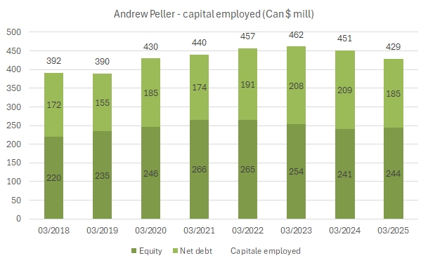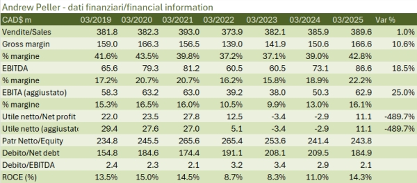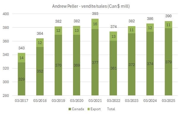 - Le vendite nell’esercizio chiuso a marzo 2025 sono cresciute dell’1% a 390 milioni di dollari canadesi. Come sapete Andrew Peller vende praticamente tutto sul mercato domestico, con soltanto 11 milioni di esportazioni (peraltro in calo significativo).