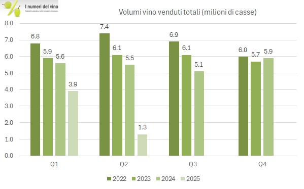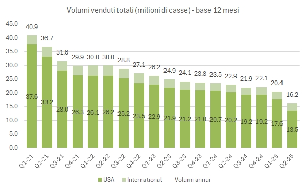 - I volumi trimestrali sono passati da 5.5 a 1.3 milioni di casse (-76%). La cosa interessante è che la divisione vino sta diventando “internazionale” dato che le casse vendute in USA sono passate da 4.9 a 0.8 milioni, mentre quelle nel mercato internazionale sono scese “solo” del 17% a 0.5 milioni di casse.