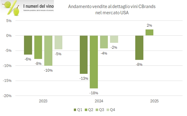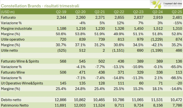 La prova che la divisione vino di Constellation Brands si sta sciogliendo come neve al sole è nei dati del secondo trimestre 2025, il primo che esclude completamente i marchi venduti, dove si può vedere facilmente come le vendite in valore siano calate del 65% con un calo del 19% del fatturato “rimanente”. Nella divisione vino, l’azienda sia passata da 71 milioni di utile operativo (secondo trimestre 2024) a 20 milioni di perdita (secondo trimestre 2025). Ma le cattive notizie per Constellation Brands non sono state queste negli ultimi mesi. Lo è stato piuttosto il “profit warning” emesso in settembre con un taglio dell’utile per azione previsto del 10%, che badate bene non è dovuto al vino (le cui indicazioni erano già drammatiche). Così il valore delle azioni ha perso il 35% da inizio anno, comprendendo anche un leggero rimbalzo proprio nella settimana dei risultati.