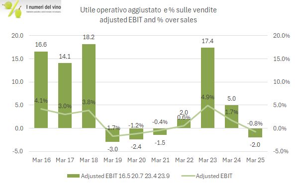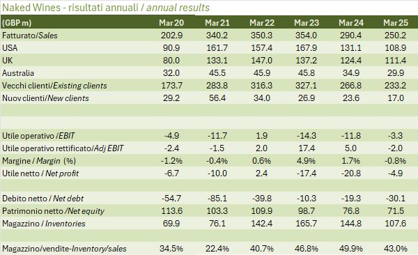 Naked Wines procede sulla via del ritorno agli utili e alla creazione di valore per gli azionisti attraverso l’ottimizzazione del capitale circolante (riduzione delle scorte in eccesso) e di un pesante taglio dei costi che, ovviamente, ha anche delle ripercussioni negative sulle vendite. Infatti, dopo aver registrato nel 2024 un calo delle vendite del 14%, per il 2025 si prevede un ulteriore calo del 15/20%, ma senza un deterioramento ulteriore delle perdite. Infatti, l’EBITDA che nel 2024 è stato di 6.7 milioni (di sterline, come tutti i prossimi riferimenti) è previsto essere stabile con una posizione di cassa destinata a crescere da 30 milioni del 2024 a 35-39 milioni. Il titolo in borsa ha cominciato a reagire, passando dai 45 milioni di valore azionario a marzo 2025 ai 60 milioni attuali. Secondo il management però varrebbe anche di più considerando la cassa di 30 milioni e la possibilità di realizzare circa 40 milioni di inventario in eccesso. Viene poi sottolineato il potenziale di generare cassa dell’attività, e questo è un tema molto più aleatorio, ma per ora restiamo sul commento dei dati 2024.